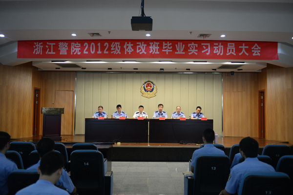 发表时间:2014-06-26 来源: 浏览量:次 2014年6月26日上午,浙江警察学院温州教学点举行2012级体改生毕业实习动员大会。会议由安防学院(筹)党委委员、市警校校长胡益逊主持。浙江警察学院继续教育学院院长钟华明,温州市公安局党委委员、安防学院(筹)副院长、纪委书记杨枝立等领导出席大会并作重要讲话。 首先,杨枝立副院长作了毕业实习动员讲话,其次胡校长宣读了实习小组组成和组长名单,然后学生代表胡上杰作了表态发言,最后钟华明院长作了重要讲话。