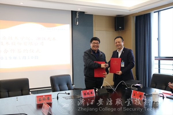 最后,季凌斌副院长代表学院与浙江元本检测技术股份有限公司签署了校企合作协议,并为其授予“安防学院校外实习实践基地”标牌。