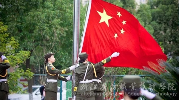在庄重的音乐声中,我院女子国旗护卫队迈着铿锵有力的步伐,护卫着国旗走向升旗台。在雄壮嘹亮的国歌声中,全场人员列队向国旗行注目礼,鲜艳的五星红旗迎着朝阳,冉冉升起。作为温州市高校首支女子国旗护卫队,我院女子国旗护卫队由在校女生组成,是一个有着严明的纪律、硬朗的作风、团结友爱的精神、深厚的战友情谊的半军事化组织,生动诠释着学院准警务化教育管理的理念。