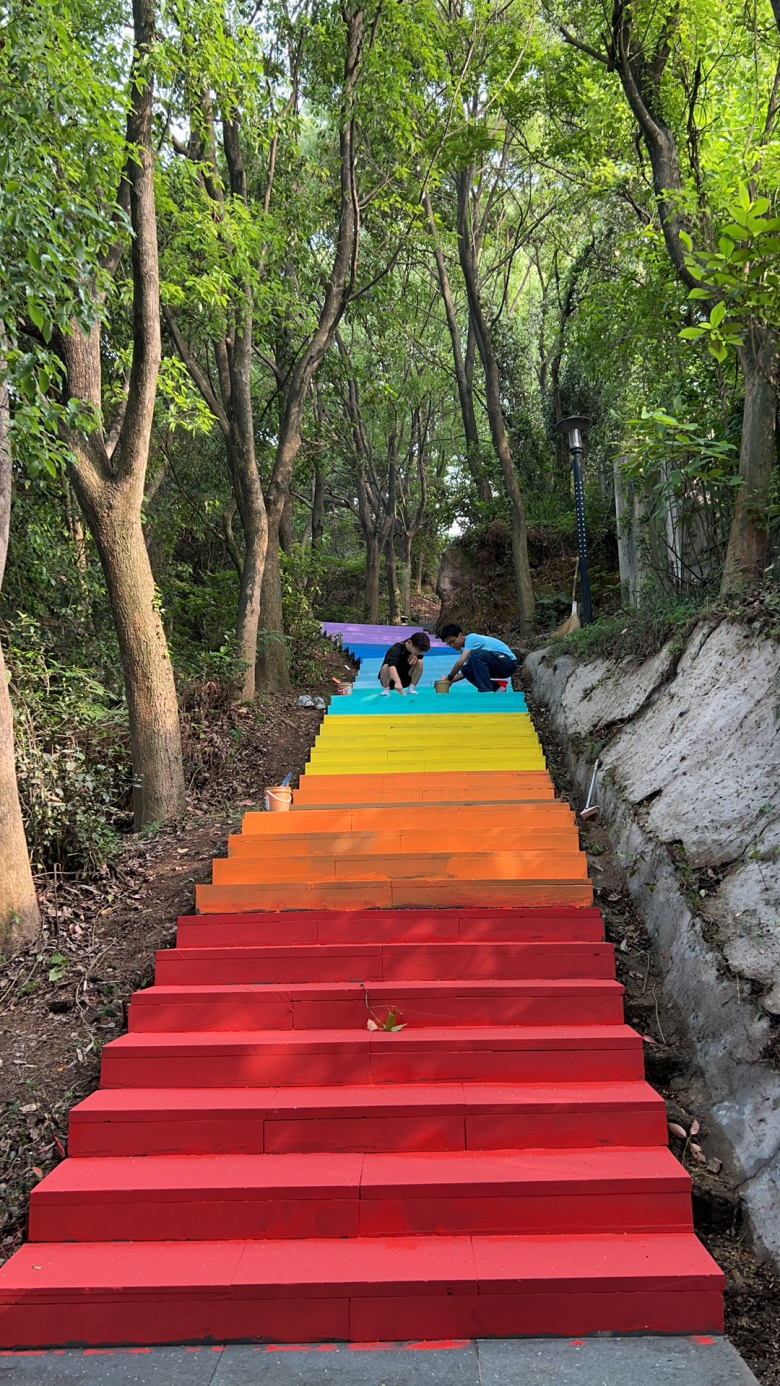 “学校即将迎来办学10周年校庆日,我们想要亲手描绘出一条彩虹送给学校。”浙江安防职业技术学院(以下简称安防学院)应急技术学院大一学生吴新杰在描绘安防学院后山的彩虹路时如是说。近日,安防学院喜迎办学10周年校庆,又即将迎来“五一”国际劳动节,该校应急技术学院精心策划了一堂生动有趣的“浸润式”劳动教育课堂,引导学生用双手为学校送上了一份别样的礼物。