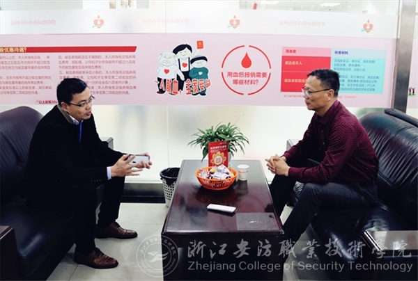 在温州市中心血站,戴海东院长与中心血站站长黄国永促膝长谈,戴院长表示,安防学院高度重视以德育人,把培养有社会责任感、助人为乐、品德优良的学生作为育人的重要使命。学院的学生积极参加志愿者服务,开展安全宣传、青春惠基层,受到社会好评。今后,学院也将继续引导学生弘扬正能量。黄国永站长对戴院长的率先垂范及育人理念表示赞赏,随后陪同戴海东院长参观了血站的功能科室。