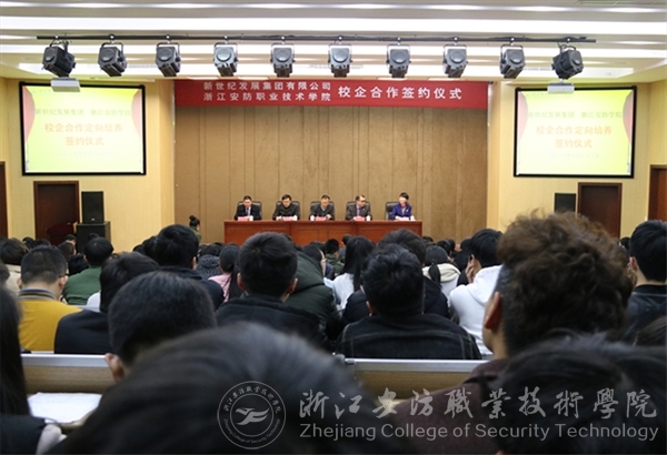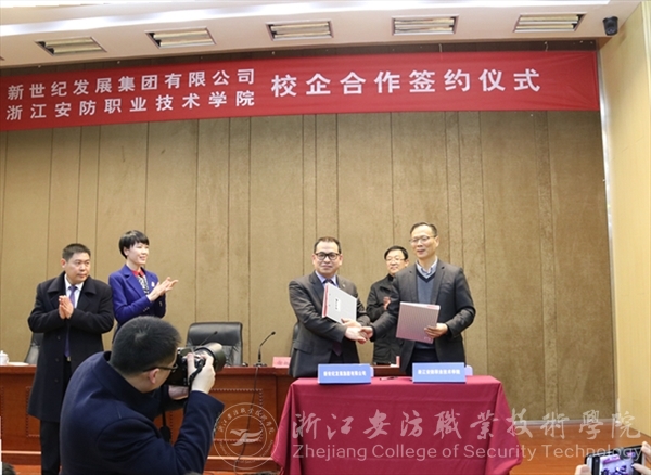 新世纪发展集团有限公司董事长谢炳超、浙江安防职业技术学院院长戴海东分别代表双方签署校企合作定向培育协议书。