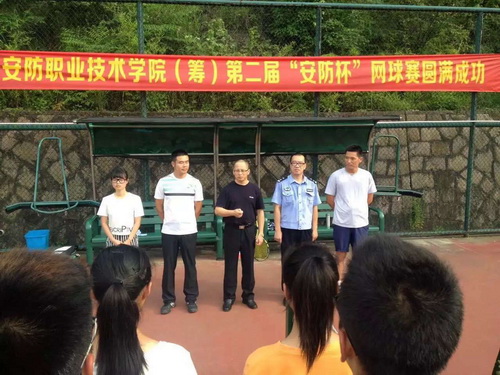 发表时间:2015-06-17 来源:管理员 浏览量:次 2015年6月17日下午,我校“安防杯 ”网球赛开幕式在学院网球场开幕。温州警校校长胡益逊、学生处老师项纪明、学院团委副书记张豫、总务处盛冰以及校社团联合会会长高青青出席了本次开幕式。