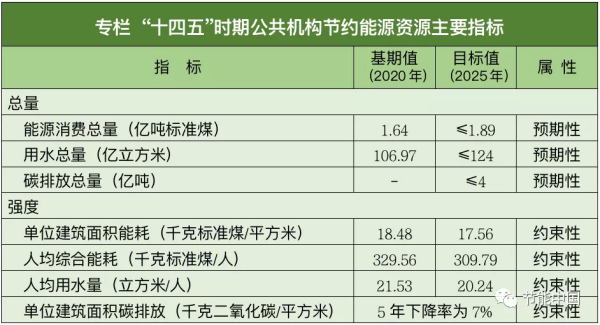 (四)主要目标。聚焦绿色低碳发展的目标,实现绿色低碳转型行动推进有力,制度标准、目标管理、能力提升体系趋于完善,协同推进、资金保障、监督考核机制运行通畅,开创公共机构节约能源资源绿色低碳发展新局面。实施公共机构能源和水资源消费总量与强度双控,公共机构能源消费总量控制在1.89亿吨标准煤以内,用水总量控制在124亿立方米以内,二氧化碳排放(以下简称碳排放)总量控制在4亿吨以内;以2020年能源、水资源消费以及碳排放为基数,2025年公共机构单位建筑面积能耗下降5%、人均综合能耗下降6%,人均用水量下降6%,单位建筑面积碳排放下降7%。